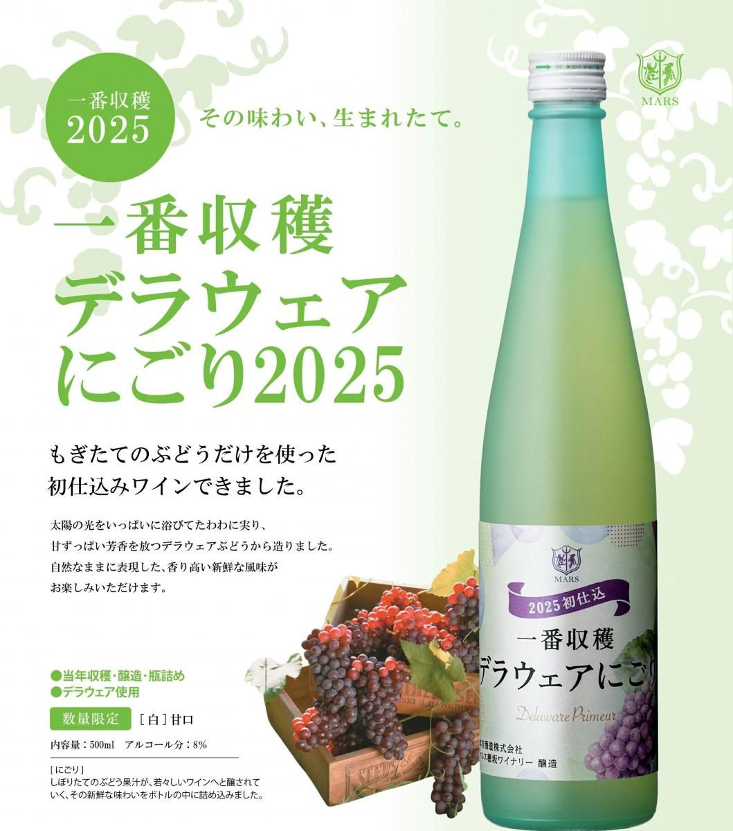 デラウェアぶどう搾りたての味わいそのままに、ボトルいっぱいに詰め込んだ初仕込みワインです。みずみずしくフルーティーでフレッシュな芳香と爽やかな甘みが豊かに広がります。
